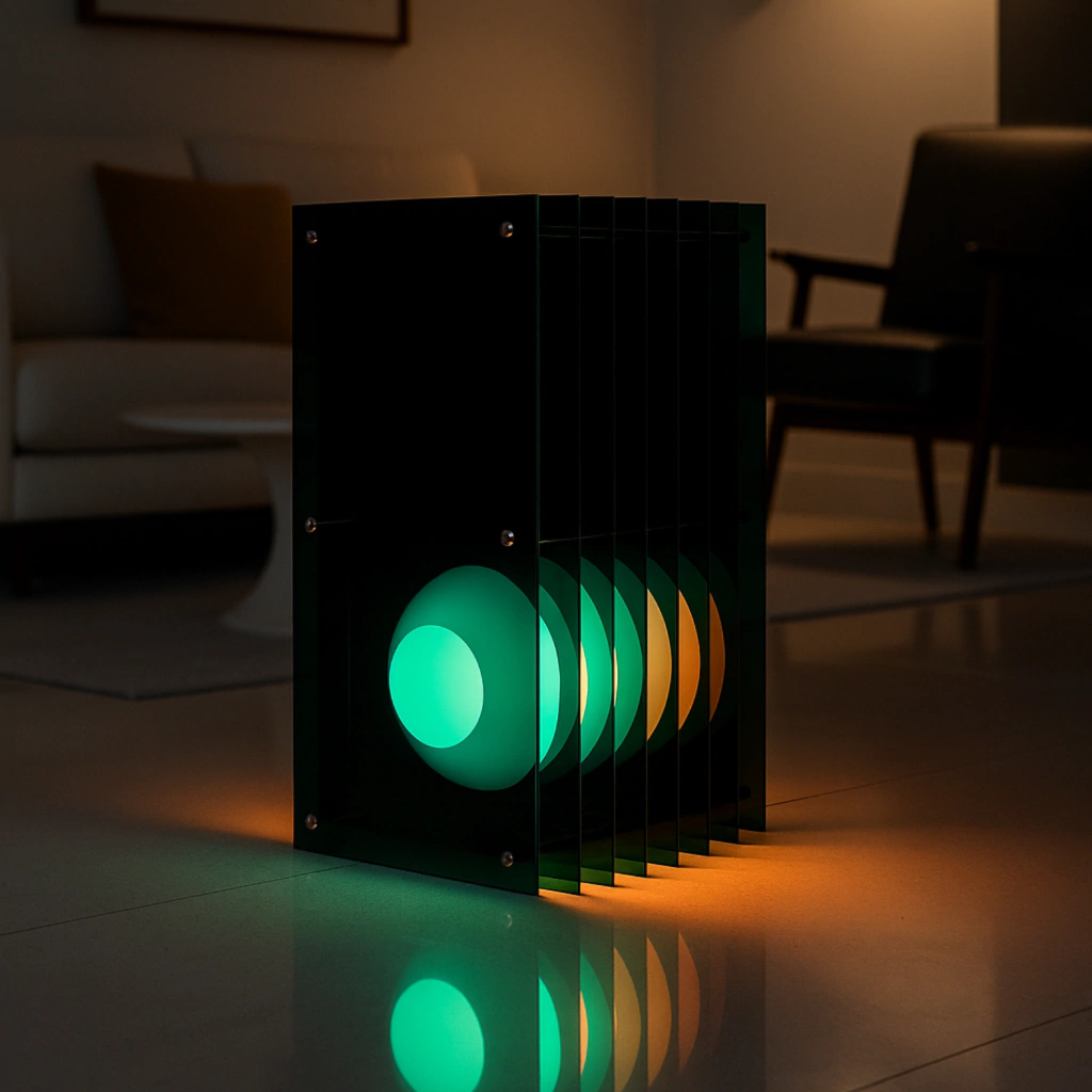 Con una esfera luminosa central enmarcada por paneles de acrílico translúcido, crea un hipnótico juego de luces, sombras y profundidad que cambia según la perspectiva. Un verdadero punto focal para espacios que buscan destacar con estilo.